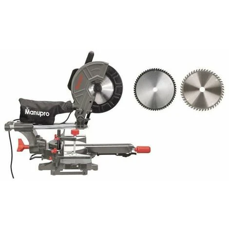 Manupro Scie a onglet radiale multi matériau pour couper avec précision le bois, le plastique et le métal – Vitesse de rotation : 3200 – 4500 tours / minute selon les 2 vitesses – Capacité de coupe a 90° : 340×90 mm – Tete de scie inlcinable a gauche a 45° – Guidage laser et lampe de travail LED pour une précision de coupe maximale – Collecteur de poussieres inclus