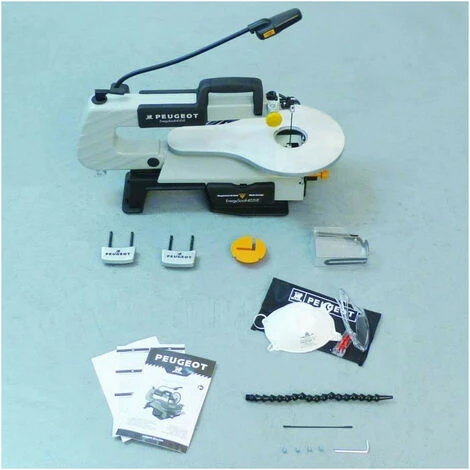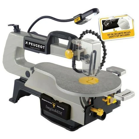 PEUGEOT Scie a chantourner Energyscroll 405VE – Puissance : 80W – Capacité de coupe : 57mm max – Table pivotante 45° – Type de montage ergots – Variateur de vitesse – Type de table aluminium – Eclairage Led – Soufflette incorporée – Compartiment pour le stockage des lames – 2 extensions de table rétractables. MASQUE NON DISPONIBLE TEMPORAIREMENT