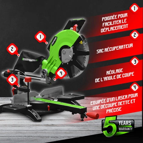Cette scie à onglets radiale 2100 W de la marque Constructor est parfaite pour la découpe de bois, de panneaux MDF, … Elle dispose d’une lame de 305 mm de diamètre (60 dents) et elle possède une longueur de coupe max de 33 cm et une profondeur de coupe max de 10 cm. Son guide laser permet de réaliser des découpes nettes et précises.