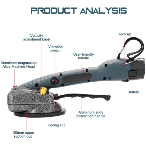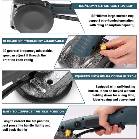 Il s’agit d’une sorte de machine à carrelage de qualité, avec une grande ventouse de 100 * 100 mm, supportant une opération à une main, avec une capacité d’adsorption de 45 kg. 10 vitesses de fréquences réglables, vous pouvez l’ajuster facilement grâce au bouton de rotation. Facile à corriger la position du carreau, il suffit d’appuyer fermement sur la poignée et de retirer le carreau. Large application : convient pour la pose de carreaux de 0,6 à 1,2 m.
